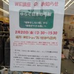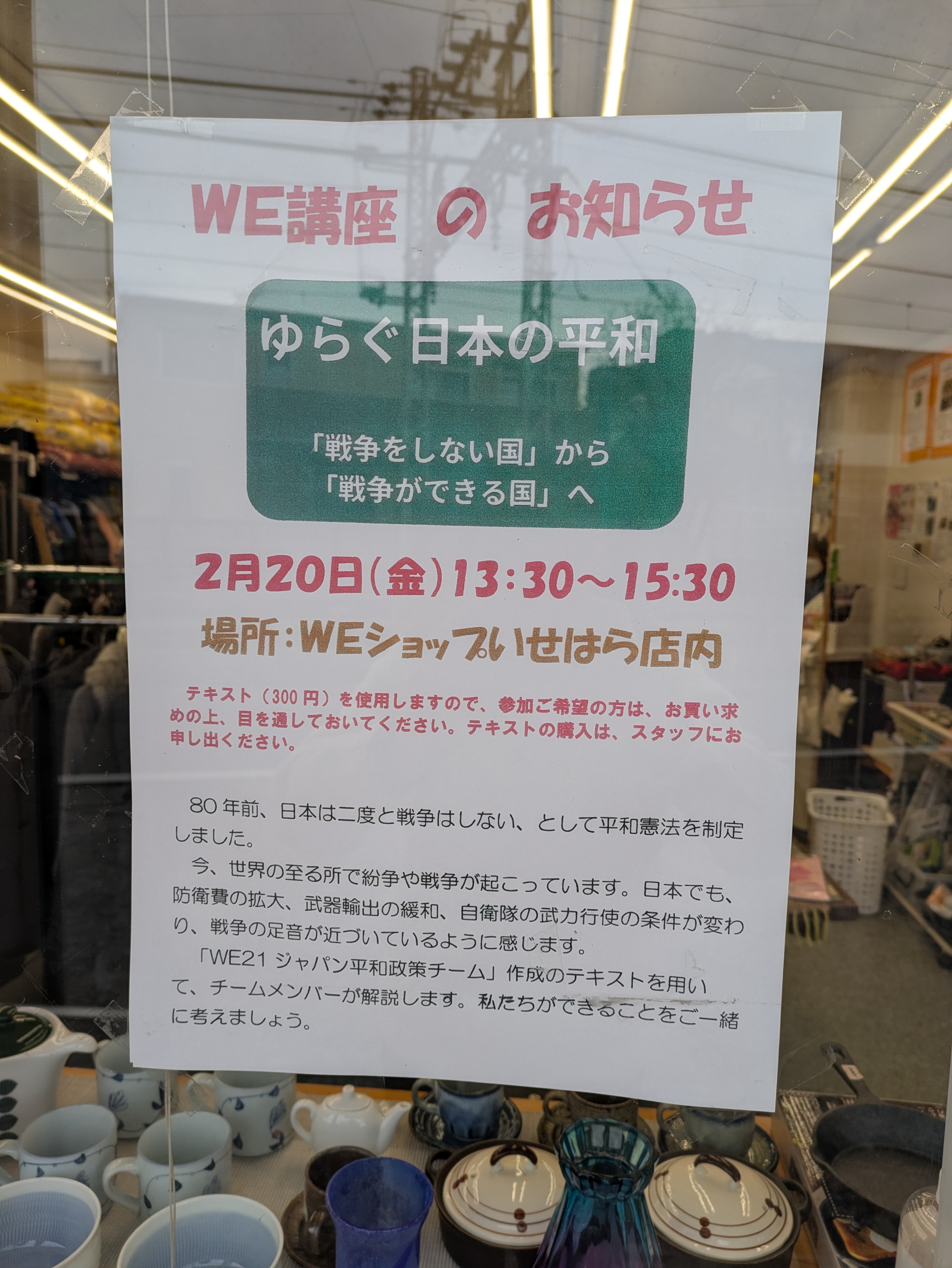 2月20日(金)、WEショップいせはら店内にて、WE講座 ゆらぐ日本の平和 「戦争をしない国」から「戦争ができる国」へ